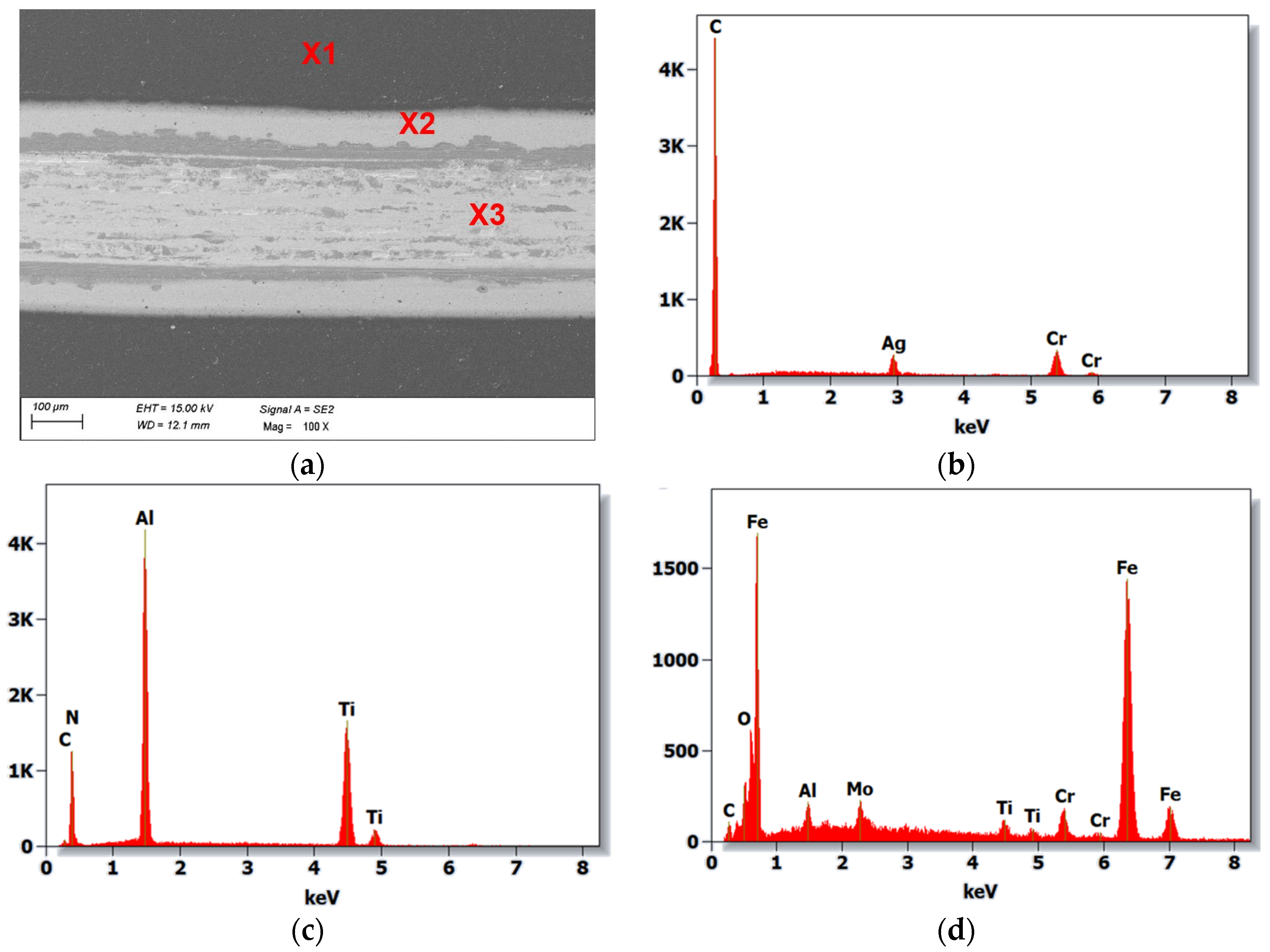 Figure 3). For the AlCrTiN/DLC, TiN/DLC, and CrN/DLC systems, the core layers (AlCrTiN, TiN, or CrN) were deposited using the CAE-PVD method, and each was overlaid with a DLC coating deposited by MS-PVD. In all cases, a CrN sublayer approximately 1 µm thick was positioned beneath the DLC layer, which itself reached a thickness of about 1.2 µm.