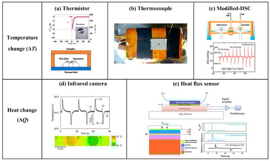 Direct measurements. (a) Thermistor method [17]; (b) thermocouple method [29]; (c) modified-DSC method [31]; (d) infrared thermography [32]; (e) heat flux sensor method [20,34].