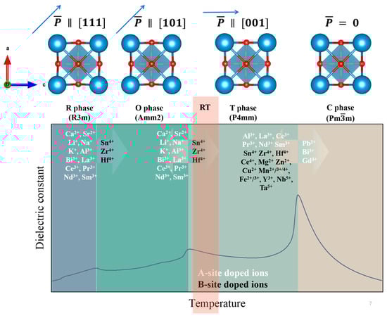 Figure 3. Temperature- and dopant-dependent phase structure evolution. - Large phase transition enthalpy. Pristine BaTiO3 exhibits a phase transition enthalpy of approximately 900 J/kg, characterized by a first-order phase transition feature [93]. Under the influence of the electric field and the temperature, this enthalpy can be modulated. Although doping may slightly alter the phase transition enthalpy, when the doping concentration is low, the combined effect of phase transition enthalpy and the ECE can lead to an enhanced isothermal entropy change and adiabatic temperature change.