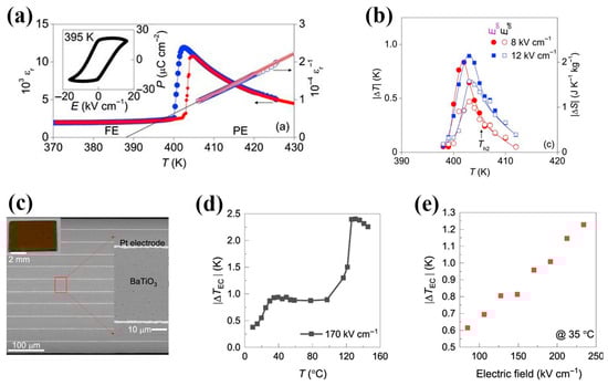 (a) Ferroelectric transition in pristine BT single crystal near . Relative permittivity () versus temperature on cooling (blue) and heating (red). A linear fit to the inverse permittivity data above ≈ 402 K is also shown (black line). Inset: P(E) measured just below . The small high-field reduction is attributed to electrical conductivity at the high measurement temperature. (b) Directly measured values of ||, as a function of starting temperature, due to the application (Eon) and subsequent removal (Eoff) of 0.8 and 1.2 MV/m [75]. (c) Cross-section SEM images of BT MLCC. The inset shows a top view of the MLCC. EC temperature change as a function of (d) starting temperature with an excitation of 17 MV/m, and (e) electric field at 35 °C. Temperature changes are recorded when the electric field is removed [76].