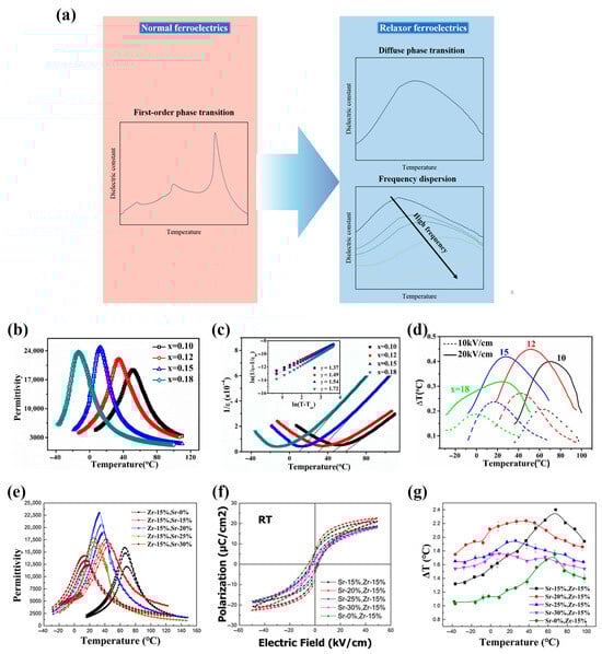 (a) Schematic diagram of construction of relaxor ferroelectrics. (b) Temperature dependence of dielectric permittivity for Ba(SnxTi1−x)O3 (measured at 10 kHz). (c) Temperature dependence of inverse dielectric constant of BST ceramics. In the inset, the double-logarithmic plots deduce diffuseness constant γ. (d) Indirect ECE characterization of BST ceramics at selected electric fields. [77] (e) Permittivity as a function of temperature for BSZT bulk ceramics measured at 100 Hz, 1 kHz, and 10 kHz: Sr2+-doped Ba(Zr0.15Ti0.85)O3; (f) polarization as a function of electric field in Sr2+-doped Ba(Zr0.15Ti0.85)O3 in RT; (g) direct measurement of electrocaloric response as a function of temperature in Sr2+-doped Ba(Zr0.15Ti0.85)O3 bulk ceramics under an electric field of 5 MV/m [78].