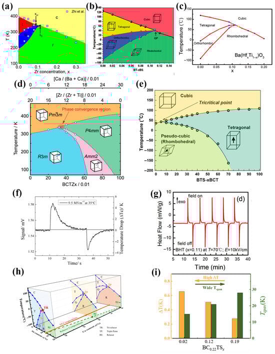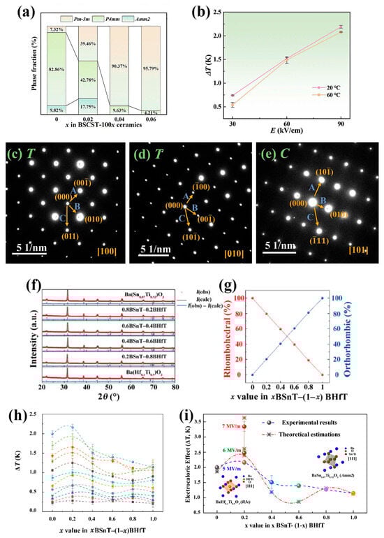 (a) Tetragonal, orthorhombic, and cubic phase fraction in (Ba0.65Sr0.3Ca0.05)(SnxTi1−x)O3 (BSCST-100x) ceramics (x = 0, 0.02, 0.04, and 0.06). (b) ΔT of BSCST-2 ceramics calculated from heat flow. (c–e) SAED patterns along the zone axis (x = 0) [1,0,0] and (x = 0.02) [0,1,0], [1,0,1], corresponding to the T and C phase regions [37]. (f) XRD patterns of xBa(Sn0.07Ti0.93)O3–(1−x)Ba(Hf0.1Ti0.9)O3 (xBSnT–(1−x)BHfT) ceramics. (g) Phase fractions of orthorhombic phase (blue line) and rhombohedral phase (red line) related to different compositions. (h) Directly measured ECE results for xBSnT–(1−x)BHfT ceramics under 5 MV/m. (i) Directly measured ECE results for xBSnT–(1−x)BHfT ceramics under different electric fields [18].