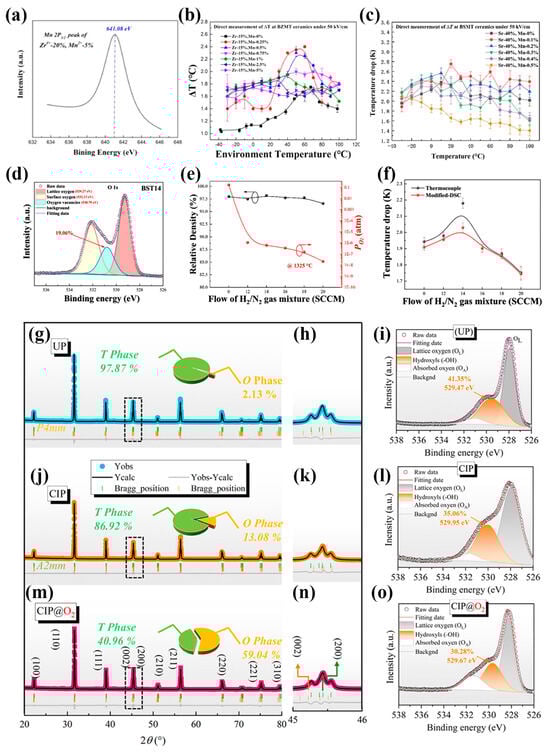(a) XPS spectra of Mn 2p3/2 peaks in Ba(ZrxMnyTi1−x−y)O3 samples, where x = 0.20 with y = 0.05; (b) as a function of temperature in Zr4+, Mn2+-codoped BT ceramics under 5 MV/m [82]. (c) for Mn2+-doped BST ceramics directly measured at temperatures ranging from –30 to 100 °C under 5 MV/m: Sr = 40% [83]. (d) X-ray photoelectron spectra of the oxygen element in Ba0.7Sr0.3TiO3 bulks sintered under different oxygen partial pressures. (e) Relative density of Ba0.7Sr0.3TiO3 bulks and specific value of oxygen partial pressure as a function of flow rate of the H2/N2 gas mixture at 1325 °C. (f) Comparison of DSC and thermocouple-derived ECE results [84]. (g,j,m) XRD patterns of the ceramics for different forming methods. Additionally, the zoomed-in profile within dashed squares in the range of 2θ = 45–46.0 are shown in panels (h,k,n). (i,l,o) X-ray photoelectron spectra of oxygen in BSZMT ceramics with different forming methods [38].