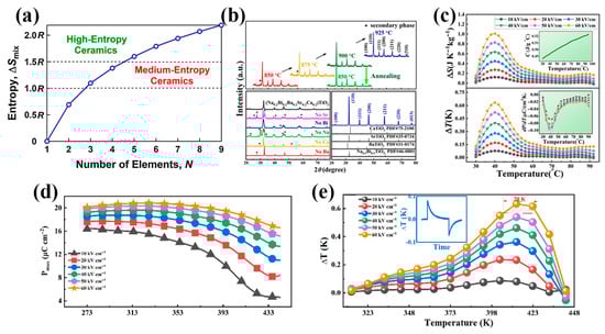 - Du, F.; Song, Z.; Xu, Y.; Han, D.; Li, Q.; Zheng, S.; Shen, J.; Qian, X. Multi-element B-site substituted perovskite ferroelectrics exhibit enhanced electrocaloric effect. Sci. China Technol. Sci. 2023, 66, 1119–1128. [Google Scholar] [CrossRef]