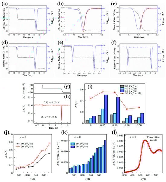 - Huang, Y.; Ma, X.; Shi, W.; Zhang, H.; Tran, N.-M.; Laletin, V.; Shur, V.; Lu, S.; Jin, L. Electrocaloric effect in chemically modified barium titanate ferroelectric ceramics. Ceram. Int. 2024, 50, 50098–50106. [Google Scholar] [CrossRef]
