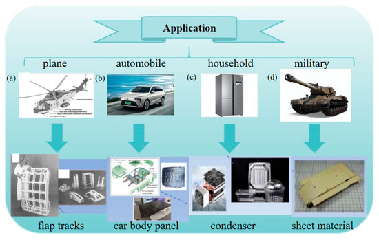 Applications of Al alloys in different fields: (a) Al alloy precision casting of baggage compartment door and flap tracks used on Airbus aircraft [6,9]. (b) Car body panel used in automobile. (c) Condenser used in fridge. (d) Sheet material used in tank [10].