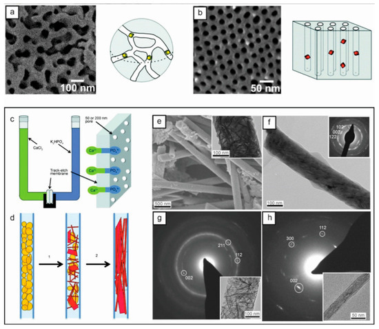 SEM images and diagrams showing glass with controlled apertures: (a) 55 nm aperture and (b) integral Pt-coated p-PCHE that is 30 nm in diameter with cylindrical aperture array [27]. (c) Diagram of calcium phosphate crystallization in a double diffusive configuration in the membrane pore. (d) The crystallization sequence’s diagram begins with amorphous calcium phosphate particles, which are yellow; next, they are converted to hydroxyapatite, which is red. Hydroxyapatite’s preferred alignment is the [001] axis aligned with the hole’s long axis. SEM and TEM images (e) of crystals grown in 200 nm holes 6 days later and hydroxyapatite rods (f) in 50 nm holes 1 day later. Selected area electron diffraction images and relative TEM images of randomly pointed bars (g) from a 300 nm aperture and bars (h) parallel to a 25 nm aperture [28].