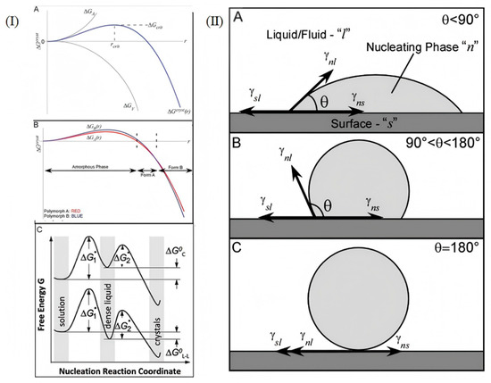 (I) (A) Functional relationship between the ∆Gcryst curve of nucleus growth and the crystal radius r. (B) A schematic diagram of the free energy distribution of two competing nuclei of polymorphic forms A and B over a characteristic length range (adapted from [34]). (C) A diagram of the two-step nucleation mechanism of crystals, ”*” displays the barrier [35]. (II) (A–C): Static equilibrium diagram in Young’s formula [34].