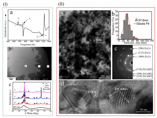 (I) (a) DSC analysis of the manufactured Zr55Cu30Al10Ni5 metallic glass at 20K min−1 heating rate. (b) The macro-profile of the cross-section of the quenched specimen, (c) the X-ray diffraction pattern, regions d, e, f of the quenched specimen. (II) (a) Quenched samples in transition areas were observed by TEM; (b) particle size distribution of ZrCu (B2) and Zr2Cu particles; (c) area e’s selected zone diffraction pattern in (a), and (d) area e’s typical HRTEM image in (a); (e) area e (adapted from [44]).