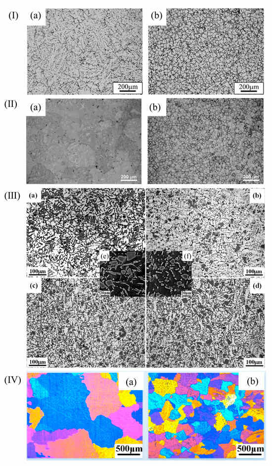 (I) (a) Uninoculated aluminum alloy; (b) inoculated aluminum alloy [45]. (II) (a) Uninoculated aluminum alloy; (b) inoculated aluminum alloy [46]. (III) (a) Uninoculated aluminum alloy; (b) 0.1 wt.% inoculated; (c) 0.2 wt.% inoculated; (d) 0.4 wt.% inoculated; (e) and (f) high-magnification SEM images of (a) and (c) [1]. (IV) (a) Uninoculated aluminum alloy; (b) inoculated aluminum alloy [47].