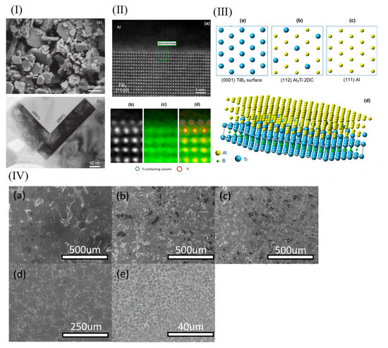 (I) (a) In a deeply corroded sample of commercial Al-5Ti-1B grain refiners, TiB particles were shown by SEM to have a hexagonal structure; (b) TEM images showed that the TiB particles were a typical (0001) crystal plane. (II) (a) Superparamagnetic Z against HAADF images; (b) HAADF with localized Z contrast at the Al/TiB2 interface; (c) TiK edge (green) atom-resolved EELS images; (d) overlap of partial Z contrast images with Ti K edge images. The blue ring represents titanium, and the red ring represents titanium. EELS spectra determined titanium atoms in the monolayer. (III) Schematic diagram of heterogeneous nucleation mechanism of aluminum on (0001) surface of TiB2 particles with (112) Al3Ti 2DC single layer. Atomic match at TiB2/Al3Ti 2DC/Al interface. (a) TiB2 plane; (b) Al3Ti 2DC plane; (c) Al plane; (d) Atomic matching [77]. (IV) The AlSi13Cu4MgNi2 alloys solidified with different cooling rates are analyzed by SEM (°C/s): (a) 0.15; (b) 1.5; (c) 15; (d) 150; (e) 1.5 × 105 [78].
