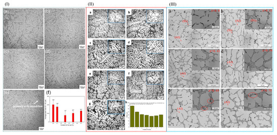 (I) The microstructure of A356 alloy with different cerium contents was analyzed by optical microscope. (a) A356 (b) A356 + 0.1% Ce by weight; (c) A356 + Ce (weight) 0.3%; (d) A356 + Ce (weight) 0.5%; (e) Ce (weight) A356 + 0.7%; (f) average particle size of a-Al with different cerium contents in a-Al [79]. (II) Microstructure evolution of A356.2 alloy treated with different processes: (a) untreated, (b–f) Al-6Sr-7La (0.1%, 0.3%, 0.5%, 0.7%, 0.9%), (g) prepared from 0.2% Al-5Ti-1B and 0.2% Al-10Sr master alloy. (h) SDAS evolution of A356.2 alloy in different processes [80]. (III) Microscopic images of A356-XSC alloy in different casting states obtained by low- and high-magnification microscope: (a) A356 alloy; (b) A356-0.21Sc; (c) A356-0.41Sc; (d) A356-0.54Sc; (e) A356-0.65Sc; (f) A356-0.75Sc [81].