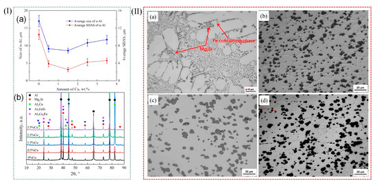 (I) (a) Average grain size (Lα) and secondary dendrite arm spacing (SDAS) of the primary α-Al phase in Al-10Mg2Si alloys with different Cu contents. (b) XRD patterns of Al-10Mg2Si alloys with different Cu contents [83]. (II) Optical micrographs under different states: (a) as-cast; (b) T1; (c) T4; (d) T6 [84].
