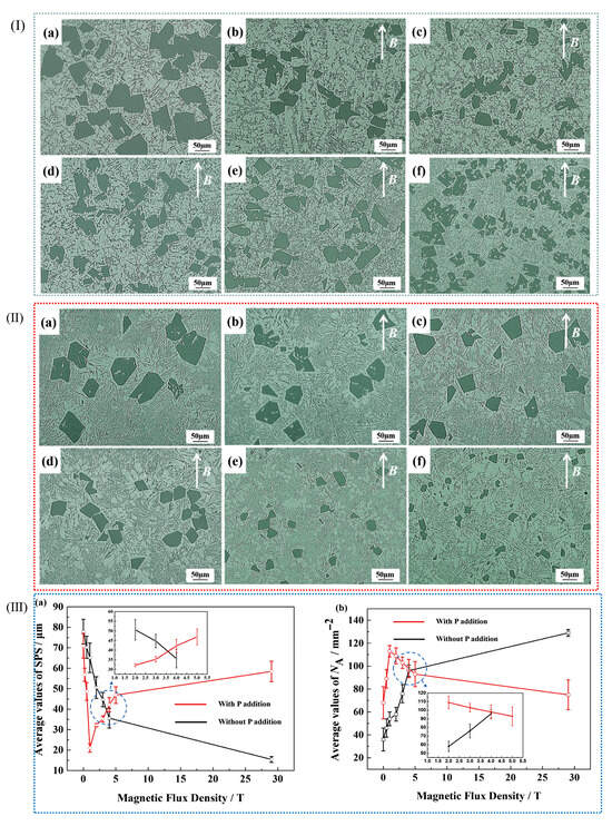 (I) Micrographs of Al-20 W% Si alloy containing P at different B levels: (a–f) 0 T, 0.5 T, 1 T, 3 T, 4 T, 29 T. (II) Micrographs of Al-20 Wt.% Si alloy without P addition at different B levels: (a–f) 0 T, 0.5 T, 1 T, 3 T, 4 T, 29 T. (III) In Al-20 Wt.% Si lines, the average SPS added by P is (a) SPS, and the average NA content is (b) NA [90].