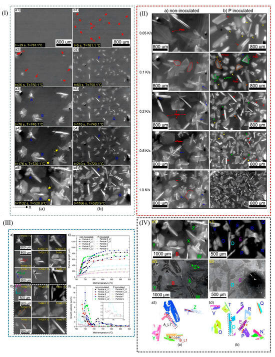 (I) (a) Field study X-ray images of uninoculated Al-22Si-18.8Cu. (a1–a5) Uninoculated microstructure in different time and temperature noted in the picture and (b) Al-22Si-18.8Cu alloy inoculated with 110 ppm P cured at the same cooling rate. (b1–b5) Inoculated microstructure in different time and temperature noted in the picture. (II) During the solidification process of (a) the uninoculated alloy and (b) the alloy inoculated with 110 ppm P, recorded by X-ray imaging techniques, the morphology of initial silicon grains of Al-22Si-18.8 Cu series alloys at different cooling rates under FOV conditions was studied. (III) (a,b) Evolution of the size and morphology of the main silicon grains selected during curing of the above two alloys; (c) evolution of the size of the single branch and flat plate of porous silicon grains marked by (a,b); the measurement error of the instrument is ±4.5 mm. (d) The growth rate of a silicon particle is calculated from the growth curve expressed in (c). (IV) The primary silicon particles of the two alloys during solidification were observed in real time by X-ray, and their microstructures were also observed. (a1) non-inoculated and (b1) P inoculated alloy. The post-solidification structure in (a2,b2). EBSD directional diagrams of certain raw silicon particles (a3,b3) [91].