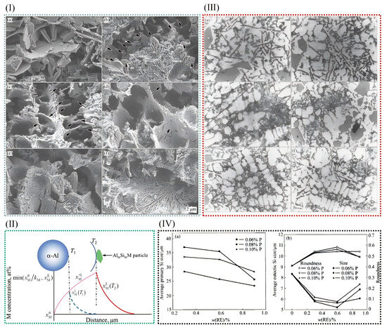 (I) Scanning electron microscope images of eutectic Si phases in unmodified Al−7Si alloy (a) and (b–f) Sr-modified Al−xSi alloys (x = 3, 5, 7, 9, and 12) [54]. (II) There is a concentration distribution of M in front of α-Al particles [103]. (III) Al-2Si alloys’ eutectic silicon morphologies modified with different modifiers: (a) P + RE-free; (b) P 0.06% + RE 0.3%; (c) P 0.06% + RE 0.6%; (d) P 0.06% + RE 0.9%; (e) P 0.08% + RE 0.6%; (f) P 0.10% + RE 0.6%. (IV) The effect of RE elements on the microstructure of primary and eutectic silicon in Al 20% alloy: (a) primary Si; (b) eutectic Si [104].