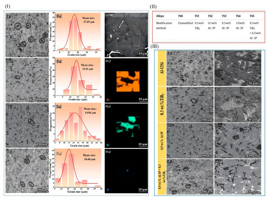 (I) Inoculated Al–13Si alloy’s microstructures: (a1–a4) TSx (x = 0, 2, 3, 4). Primary silicon phases’ size statistics: (b1–b4) TSx (x = 0, 2, 3, 4). (c1) TS3’s images in BSE; (c2–c4) area A in EDS: (c2) Al; (c3) Si; (c4) P element. (II) Modification modes for relatively numbered alloys. Containing different components of TiB2 and Al-3P. (III) SEM images: (a–d) low (a1–d1) and high (a2–d2) magnification SEM photographs of TSx (x = 0, 1, 3, 5) [11].