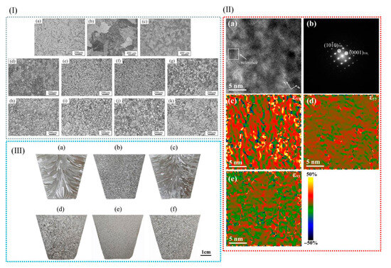 (I) Microstructures of (a) uninoculated alloy; (b) Al–Cu alloys that are uninoculated (no Ti and Zr); and (c) Al–Cu alloys that are inoculated (no Ti and Zr) with FeBSi 0.1 wt.% metallic glass for 5 min. (d–k) Microstructures of inoculated Al–Cu alloys in which different metallic glass contents are used with different inoculation times: (d–g) 5 min: (d) 0.05 wt.%, (e) 0.1 wt.%, (f) 0.2 wt.%, (g) 0.4 wt.%; (h) 1 min, 0.1 wt.%; (i) 10 min, 0.1 wt.%; (j) 30 min, 0.1 wt.%; and (k) 60 min, 0.1 wt.% [45]. (II) (a) Lattice images of TiB2 in the direction of [010] from high-resolution transmission electron microscopy, in which white squares represent reference regions; (b) power spectra of high-resolution transmission electron microscopy imaging and resolution points; and (c–e) strain fields of εxx, εyy, and εxy. (III) (a–f) The toxicity of Sc, i.e., Al-5Ti-1B’s Sc eliminating fine-grained effects, is clearly shown [83].