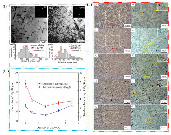 (I) (a) TEM photographs of uninoculated alloys and (b) TEM images of inoculated 0.2 wt% precipitated theta phases (c,d) relative to the statistical results of the size of the precipitated phase [46]. (II) The as-cast AlMg10Si2 alloys’ OM images with different Cu contents (wt%): (a,f) 0.0, (b,g) 0.5, (c,h) 1.5, (d,i) 2.5, and (e,j) 3.5. (III) The eutectic Mg2Si phase’s average grain size (LMg2Si) and interlamellar spacing (ILS) in the Al-10Mg2Si alloys with different Cu proportions [82].