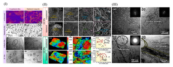 Wu et al. [82] introduced trace amounts of copper into Al-10Mg2Si alloy, which effectively refined the primary α-Al dendrites. The results indicated that while the average length of the primary α-Al dendrites was not directly stated to increase, the secondary dendrite arm spacing was significantly reduced by 352.2%, and the length of the primary α-Al dendrites was decreased by 97.7%, indicating a dramatic refinement effect. Various alloying additions, as well as processing techniques such as extrusion, rolling, laser processing, and friction stir welding, exert a profound influence on the microstructure of aluminum alloys [83], as exemplified in Figure 8I. Wang et al. [84] analyzed the microstructural evolution of Al-Si-Mg alloys in different states during friction stir welding. Their study revealed that the microstructure of the nugget zone was largely independent of the initial state of the matrix material, as shown in Figure 8II.