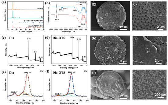 3.1.2. Physical Phase Analysis of Dia and Dia/OTS Powders