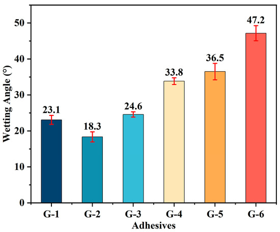 Figure 4, which includes duplicate measurements and calculated average values for each formulation. These results confirm that all epoxy solvent-borne adhesives demonstrate favorable wetting on the carbon composite surface, with G-2 exhibiting the most superior wetting performance due to its extremely low contact angles. As the amount of graphene added increases, the viscosity of the G-X adhesive increases, while its wettability decreases. The elevated viscosity directly reduces the fluidity and spreading ability of the adhesive on the surface of the adherend substrate. Additionally, the introduction of graphene sheets alters the surface tension of the adhesive system: their relatively hydrophobic surface properties may cause the adhesive’s surface tension to deviate from the range compatible with the substrate. At the same time, agglomerated sheets form a microscopically rough structure at the adhesive-substrate interface, reducing the effective contact area. These two effects collectively prevent the adhesive from thoroughly wetting the substrate, ultimately resulting in decreased wettability. Among the tested adhesives, G-6 exhibits the largest average contact angle, at 47.2°, while G-1 shows the smallest average contact angle, at 18.3°. Despite exhibiting differences, all these adhesives demonstrate wettability on the C/C composite surface.