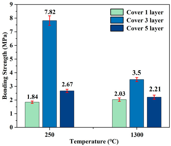 These data indicate that with the increase in the number of layers to three, the shear strength reaches the maximum value, which may be because three layers of coating can form a moderate thickness of adhesive film, ensuring sufficient interfacial contact and uniform stress distribution. However, when the number of layers increases to five, the shear strength decreases. This may be because excessive coating layers result in a too-thick adhesive film, which is prone to generating internal defects during curing or calcination, thereby reducing bonding performance. Therefore, regardless of whether the curing process is carried out at 250 °C or the calcination at 1300 °C, three coating layers are optimal. These results further confirm that the number of coating layers has a crucial impact on the bonding performance of the adhesive.