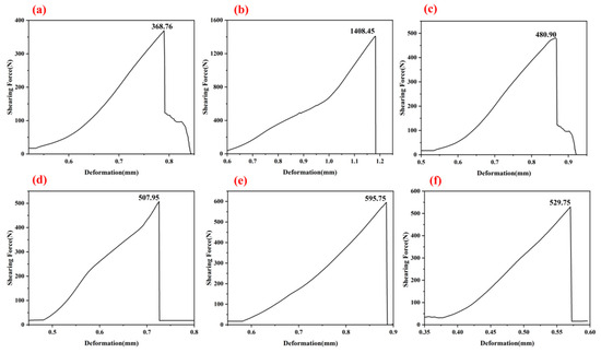 Figure 7a presents the shear force–deformation curves of bonded joints using different adhesives (three-layer configuration) after treatment at 250 °C. The curves exhibit a similarity, with a linear correlation between shear force and deformation, indicating that the bonding layer is rigid and the fracture mode is brittle. The continuous curve indicates a uniform distribution of the bonding layer structure. As shown in