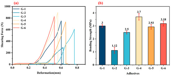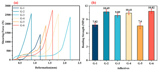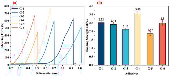 Figure 9a shows the shearing force–deformation curves. It can be observed that the curves of various adhesives (G-1 to G-6) exhibit certain regularity. With the increase in deformation, the shearing force generally shows a rising trend, and then drops rapidly after reaching its peak value, which is a typical mechanical response characteristic of the bonding failure process. The similarity of the shearing force–deformation curves in