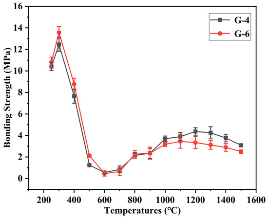 To clarify the bonding performance of this type of adhesive after treatment across the whole temperature range from 250 °C to 1500 °C, the bonding effects of G-4 and G-6 adhesives are tested following treatment at different temperatures, as shown in