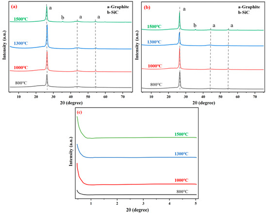 Notably, a small diffraction peak “b” emerges in the XRD patterns of adhesives treated at 1500 °C. By comparing it with standard reference cards, this peak is identified as corresponding to SiC. It is thus speculated that when the temperature reaches 1500 °C, a minor reaction takes place between a small amount of carbon in the adhesive and silicon from the ceramic container, leading to the formation of SiC. The generation of SiC, which has high hardness and good high-temperature stability, may have a specific reinforcing effect on the adhesive layer; however, due to the small amount, its impact on the overall bonding performance may be limited.