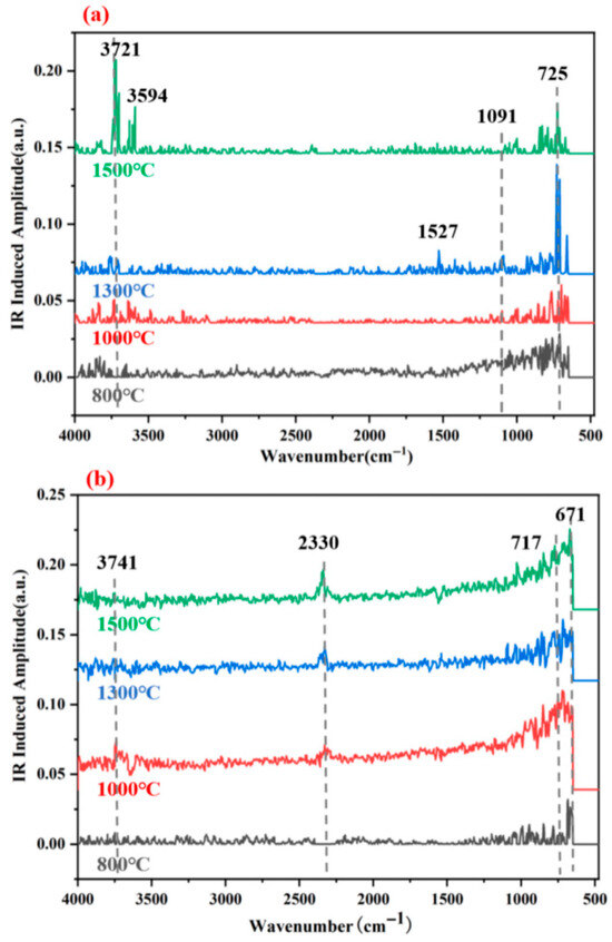 Figure 14 presents the infrared spectra of G-4 and G-6 adhesives after treatment at different temperatures. Notably, organic functional groups (e.g., most C-H, C=O in aliphatic or unstable aromatic systems) typically decompose or diminish significantly above 1000 °C. In line with this, the spectra exhibit minimal intense peaks associated with labile organic moieties. In
