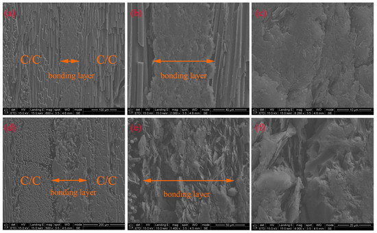 Figure 15 shows the cross-sectional SEM images of C/C joints bonded with G-4 and G-6 adhesives after treatment at 1500 °C. The bonding layer corresponding to G-4 is very dense with a thickness of approximately 90 μm, where graphene is barely visible, and carbon nanotubes are even harder to detect. In contrast, the bonding layer of G-6 is relatively loose, with a thickness of about 150 μm, and partial lamellar graphene is exposed, which is why the strength of G-6 is lower than that of G-4. Carbon nanotubes (CNTs) are hardly observable in