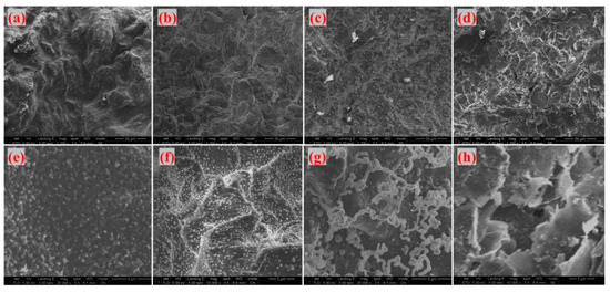 Figure 16d (G-4 at 1500 °C) and (h) (G-6 at 1500 °C), the fracture surfaces exhibit a folded morphology. This is attributed to the exposure of sheet-like graphene and the disappearance of punctate protrusions, which is scientifically reasonable: excessively high temperatures may cause CNTs to undergo graphitization or structural damage, or even lead to the decomposition of catalyst components, thereby inhibiting further CNT growth.