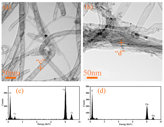 Figure 19a,b, the observed structures exhibit the typical morphological features of carbon nanotubes. Specifically, the CNTs formed in G4 have a diameter ranging from approximately 10 to 20 nm, showing excellent dispersion with minimal agglomeration. In contrast, individual CNTs in G6 can reach a maximum diameter of up to 40 nm, and they tend to agglomerate significantly, forming interconnected aggregates with a dimension exceeding 100 nm. Energy-dispersive X-ray spectroscopy (EDS) analysis revealed that both CNT samples are composed exclusively of carbon. No iron element was detected, and the presence of copper is attributed to the copper grids used for sample support.