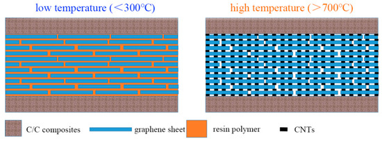 Figure 20. In this high-temperature-formed structure, graphene still functions as the “bricks”, maintaining the fundamental skeleton and mechanical support of the structure; CNTs serve as the “mortar”, not only filling the gaps between graphene sheets but also firmly binding the graphene sheets through three-dimensional reticulated connections, constructing a stable spatial structure. This new “brick-and-mortar structure” with graphene as bricks and CNTs as mortar, relying on the excellent high-temperature resistance of carbon materials, can withstand high temperatures up to 1500 °C.
