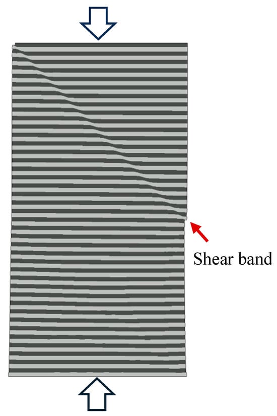 Figure 1 shows a simulated image of shear band formation in a multilayered column consisting of alternating soft/hard layers (details are given below in this paper). While in actual experiments the exact shear-band configuration depends on the material, layer thickness, specimen geometry, loading condition, alignment of test device, and existence of any material and/or geometric imperfections, the simulated deformation in Figure 1 captures the essence of strain localization in experimental observations. Although the nominally planar layers are perpendicular to the compressive loading direction, the dominant shear path traverses through multiple layers at an inclined angle of approximately 45° which is the orientation of maximum shear. Once initiated, further deformation concentrates along these shear bands, leading to eventual fracture. Similar shear banding behavior is also frequently observed in multilayered thin films deformed by nanoindentation [27,28,29,30,31,32], although, under indentation, the deformation is highly nonuniform and not uniaxial, with the shear band angle also depending on the geometry of the indentation contact.