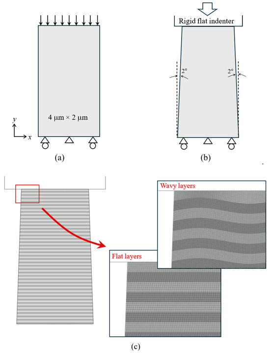 Figure 2a shows the reference numerical model along with the loading and boundary conditions. It is a 4 μm by 2 μm rectangular domain under uniform compression, with the displacement imposed on the top boundary. The y-displacement at the bottom boundary is prohibited while tangential slide is allowed, with the center point entirely fixed in x and y. To more accurately represent the micro-pillar compression test, the model shown in Figure 2b is utilized where a 2° taper exists (a tapered shape is commonly seen in actual materials fabricated by ion beam milling). For this geometry, the top of the column has a width of 2 μm and the height is 4 μm. Instead of prescribing the displacement on the top boundary, loading is implemented through contact between the specimen and a rigid flat indenter where the downward displacement is applied.