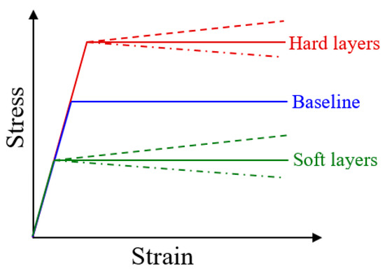 Schematics of the constitutive stress–strain behavior considered in the parametric study. A baseline elastic-perfectly plastic response serves as the reference material. The multilayers then consist of “hard” and “soft” layers with increased and decreased yield strengths, respectively. Possible linear strain hardening and strain softening are also considered.
