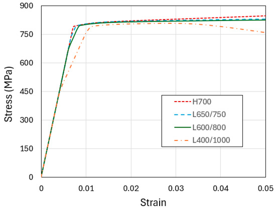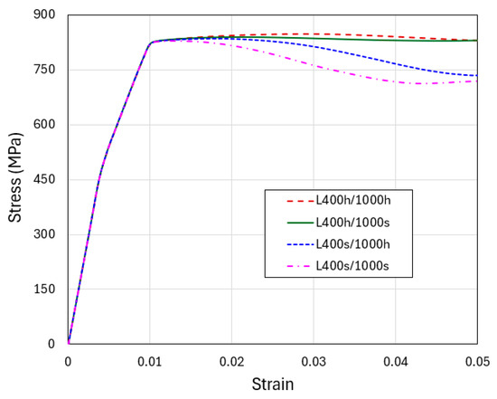 The effects of post-yield strain hardening and strain softening were analyzed in Section 3.3. Here, we present additional simulations using a stronger rate of hardening and softening, ±60 MPa, applied to the four models of L400 h/1000 h, L400 h/1000 s, L400 s/1000 h, and L400 s/1000 s. Figure A2 shows the simulated compressive engineering stress–strain curves. The overall trend is qualitatively the same as that in Figure 12. The strongest and weakest responses are L400 h/1000 h and L400 s/1000 s, respectively. The L400 h/1000 s curve is higher than L400 s/1000 h, which is consistent with the case of hardening/softening rate of ±30 MPa as discussed in Section 3.3.