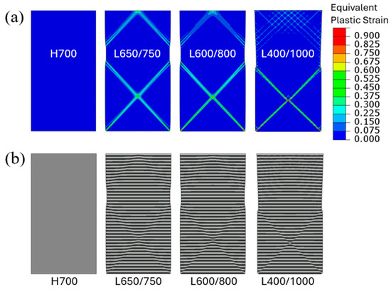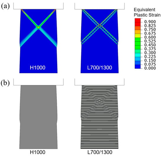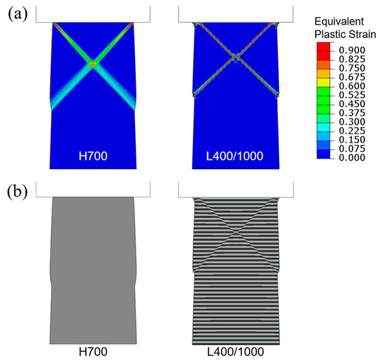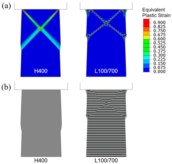 Figure 7a shows the contour plots of equivalent plastic strain in the tapered H700 and L400/1000 models, when the overall applied compressive strain is 0.04. The corresponding deformed configurations are in Figure 7b. Due to the narrower cross-section at the top, deformation is mostly carried by the upper portion where lateral bulging is apparent. One distinct feature is that the homogeneous material (H700) also displays concentrated plastic bands (which is not the case in H700 with a uniform initial width in Figure 5a). Compared with Figure 5a, the plastic strain concentration is significantly greater in the tapered structure in Figure 7a for both H700 and L400/1000. In Figure 7b, the layered geometry of L400/1000 also displays a pair of sharp shear bands with strong shear offsets. In this layered structure, at the current compression level, the shear offset brought about by the plastic instability has reached beyond one layer thickness.