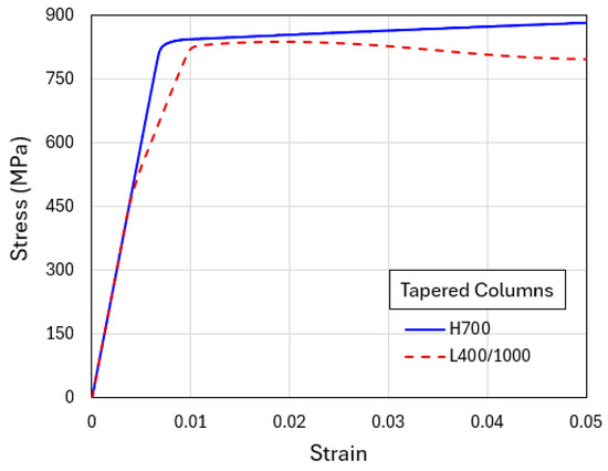 Engineering stress–strain curves obtained from the simulations of flat-indenter compression of tapered columns with material models of H700 and L400/1000.