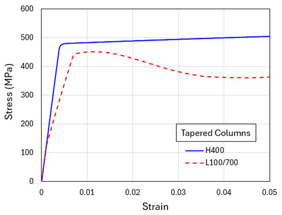 Engineering stress–strain curves obtained from the simulations of flat-indenter compression of tapered columns with material models of H400 and L100/700.