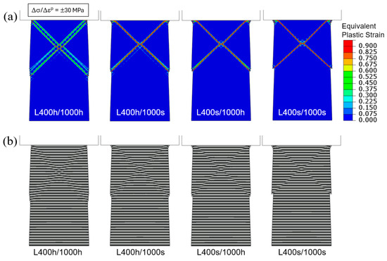 The contour plots of equivalent plastic strain and the deformed layer configurations are shown in Figure 13. As before, these snapshots correspond to an overall compressive strain of 0.04. In all cases, the localization of plastic deformation is evident. However, if both the soft and hard layers are allowed to strain-harden, the plastic bands become more diffuse and the shear offsets are less conspicuous (L400 h/1000 h, the left-most images in Figure 13a,b). The extreme case is shown in the right-most images of the figure (L400 s/1000 s) where the soft and hard layers both strain-soften upon yielding. Here, the plastic bands are very sharp, with the greatest strain values among all cases, leading to very prominent shear offsets. The other two models, L400 h/1000 s and L400 s/1000 h, exhibit intermediate behavior, with the strain-softening soft layers (L400 s/1000 h) leading to more severe strain concentration between the two. In Appendix B, we use additional strain hardening and softening parameters to illustrate the generality of the observations described above.