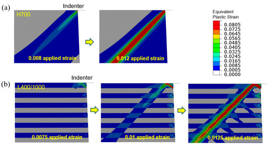 As for the layered structure shown in Figure 14b, under the 0.0075 applied compressive strain, the maximum local plastic strain appears at the lower-right corner of the top layer (softer material) adjacent to the hard layer underneath. This strong plasticity propagates along the 45° direction to the top face in contact with the indenter, and is seen to be “reflected” toward the lower-left direction and then traverses multiple layers when the applied strain attains 0.01. Significant shear displacing of the layers to create offsets generally starts at this stage. The shear band continues to grow in length and intensity, crossing the other one (originated from the upper-left region of the specimen) and reaching the free surface at the left side. In the layered structure the sharp shear steps at the free surface can be easily observed, Figure 7b.