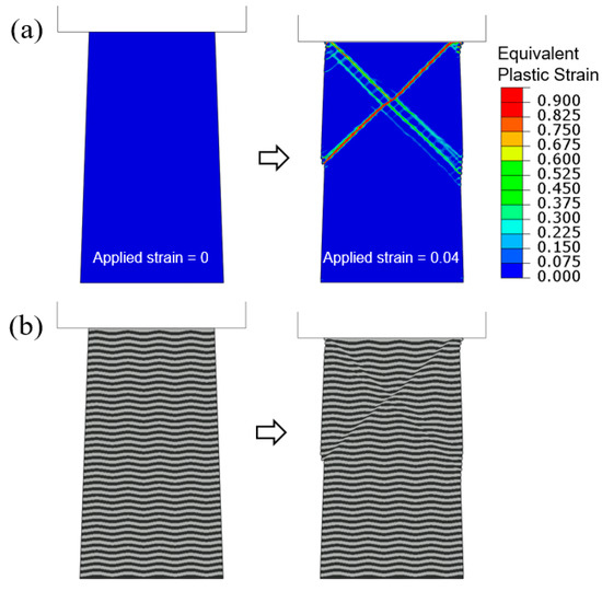 In Figure 5, Figure 7, Figure 9, Figure 11 and Figure 13, the shear bands all develop in pairs and make an “X” shape. This is due to the perfect geometry along with symmetry used in the simulations. In actual pillar compression experiments, however, one dominant band along a single direction was frequently observed [16,19,20,22,23,25]. Here, we consider a numerical model with imperfect geometry, where the interfaces between layers take the undulated form, as defined in Section 2 and shown in Figure 2c. Flat-indenter compression is imposed on this tapered column with L400/1000. The contour plots of equivalent plastic strain and the overall multilayer configurations are shown in Figure 15a,b, respectively, when the applied compressive strain increases from 0 to 0.04. With the built-in wavy layers, the structure loses its symmetry about the central vertical axis. It is seen that one shear band from the upper-right to lower-left is now dominant, and the other becomes more diffuse. In Figure 15b, the shear step created at the left free surface is much more significant.