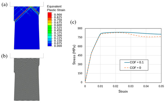 Another potentially important factor in affecting the shear band formation is the frictional characteristics at the contact between the top of the specimen and the indenter. In all the simulations presented above, the coefficient of friction (COF) is taken as 0.1. Here, we consider one case of undulated layer geometry allowing free tangential slide at the top face, i.e., COF = 0. The contour plot of equivalent plastic strain and the deformed multilayer configuration, when the applied strain is 0.04, are shown in Figure 16a,b, respectively. There are two primary shear bands generated. However, the pattern is not symmetrical. From Figure 16a, it can be seen that multiple sets of localized plastic bands have developed (due to the periodic peak/valley wavy geometry and free tangential movement at the contact), but eventually two major bands carry most of the deformation. The shear step at the left surface caused by the longer band is particularly distinct, as in Figure 16b. It is worth mentioning that this type of unsymmetric shear band emerging from the top contact has been observed in compressed Al/Pd [17] and Cu/PdSi [18] nanolayer pillars.