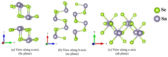At atmospheric pressure, the crystal structure of SnSe is an orthorhombic crystal system, belonging to the space group Pnma [37]. The primitive unit cell comprises eight atoms, containing four Sn and four Se. Its lattice constants are a = 4.28 Å, b = 4.30 Å, and c = 11.99 Å. In order to better study the regulation of uniform strain application on b-axis thermoelectric properties, we choose 2 × 1 × 1 supercell to calculate its thermoelectric parameters. Prior to applying strain, the initial structure was optimized using the VASP 5.4.4 software to attain the most stable configuration. The optimized lattice constants are a = 9.18 Å, b = 4.19 Å, and c = 11.75 Å. Figure 1 shows the crystal structure along the a-, b-, and c-axis (bc, ac, and ab planes).