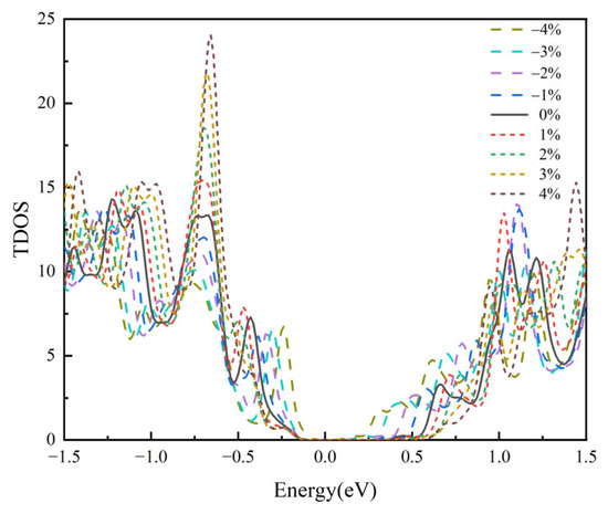 The total density of states (TDOS) diagram for SnSe material is shown in Figure 2. Some researchers have proposed that the characteristics of the density of states (DOS) near the Fermi level can reveal changes in the Seebeck coefficient (S) and the electrical conductivity (σ) of materials [43,44]. When there are significant fluctuations in the DOS on both sides of the Fermi level, it facilitates the transport of charge carriers through the material. Furthermore, when the DOS peaks are closer to the Fermi level, the density of available electronic states near the Fermi energy is higher. This higher DOS can lead to an increased probability of electron transitions, which in turn can enhance the charge-carrier mobility and thus contribute to higher σ. By comparing the valence band and conduction band near the Fermi level in the TDOS diagram, it is found that VBM and CBM are close to the Fermi level under compressive strain. On the contrary, under tensile strain, VBM and CBM will be far away from the Fermi level. Additionally, applying strain causes the slope of the DOS near the Fermi level to increase, which may lead to a larger S [45]. The findings from the energy band analysis are in agreement with the changes in the density of states, so they can further reflect the S and σ changes in materials under strain regulation.