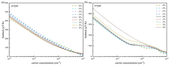 Firstly, our investigation focused on how strain influences the S in SnSe. As shown in Figure 3, it illustrates the changes in S for both p-type and n-type SnSe in relation to carrier concentration under diverse strain circumstances at 300 K. The results indicate that the strain efficiently modulates the S, with p-type and n-type SnSe showing similar trends. Under different strains, S is approximately linear and diminishes as carrier concentration rises. At a particular carrier concentration, the absolute Seebeck coefficient of p-type SnSe is always higher than that of n-type SnSe without applying strain. For instance, at a carrier concentration of 1018 cm−3, p-type and n-type SnSe have Seebeck coefficients of 460 μV·K−1 and 364 μV·K−1, respectively, which may be due to the fact that the valence band near the Fermi level in the band structure is smoother and the DOS of the corresponding valence band is steeper. As illustrated in Figure 3a, for p-type SnSe, compressive strain is more effective than tensile strain. Applying compressive strain enhances the S. Conversely, as shown in Figure 3b, the introduction of compressive strain leads to a reduction in the absolute Seebeck coefficient for n-type SnSe, whereas tensile strain raises it. When the tensile strain is 4%, the effect is most noticeable.